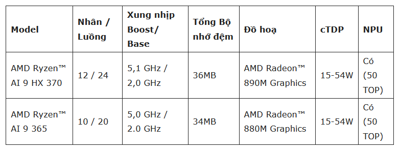 | AMD Ryzen™ AI 9 365 | 10 / 20 | 5,0 GHz / 2.0 GHz | 34MB | AMD Radeon™ 880M Graphics | 15-54W | Có (50 TOP) |
